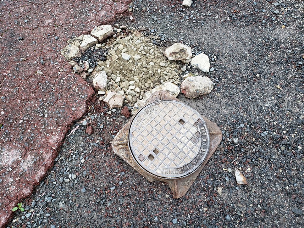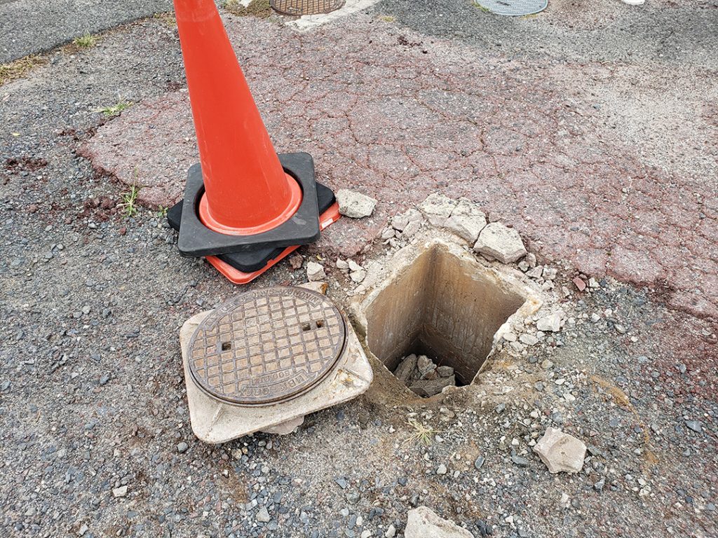 現場を確認すると、以前使われていた汚水桝の蓋が何かのはずみで壊れてはずれ、枡の中が見える状態になっていました。