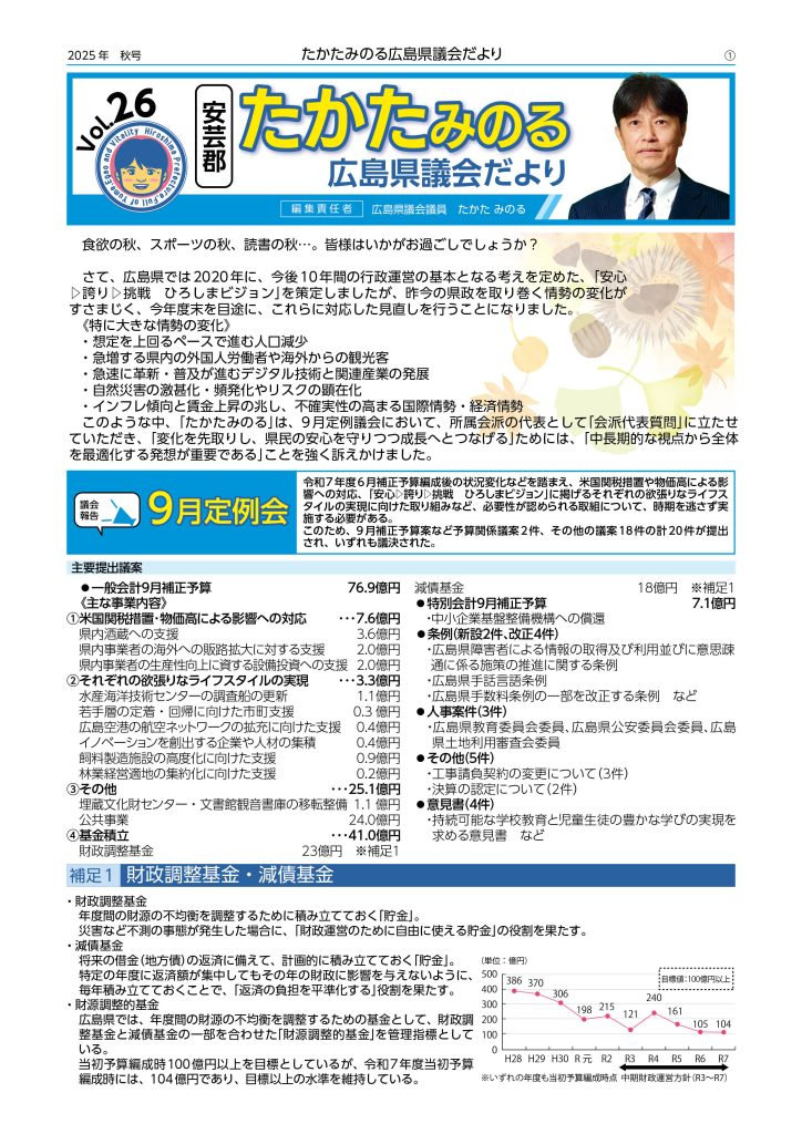 9月定例議会の内容をまとめて「県議会だより(秋号)」として、後援会に加入いただいている方を中心に発送いたしました。