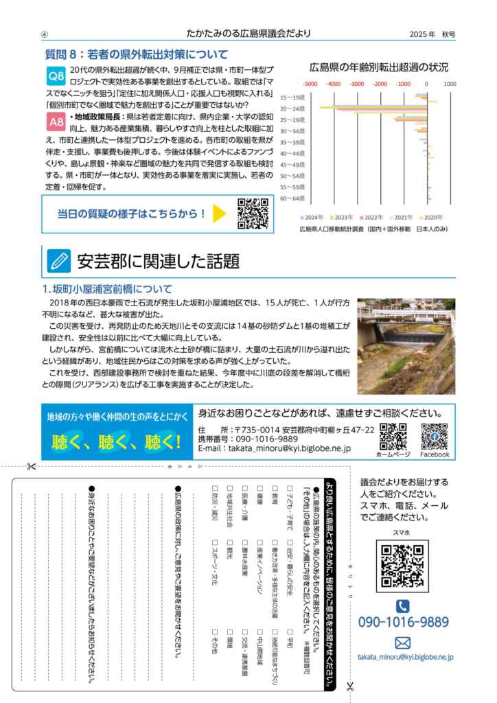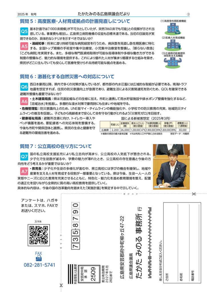 ■ 10月14日(火) 県議会だより(秋号)発送 9月定例議会の内容をまとめて「県議会だより(秋号)」として、後援会に加入いただいている方を中心に発送いたしました。本号では、高田が会派を代表して行った「会派代表質問」の内容などを中心に掲載しています。新たに紙での発送が必要な方や、どなたかご紹介をしてくださる方がいらっしゃいましたら「お問い合わせフォーム」に入力しご連絡ください。