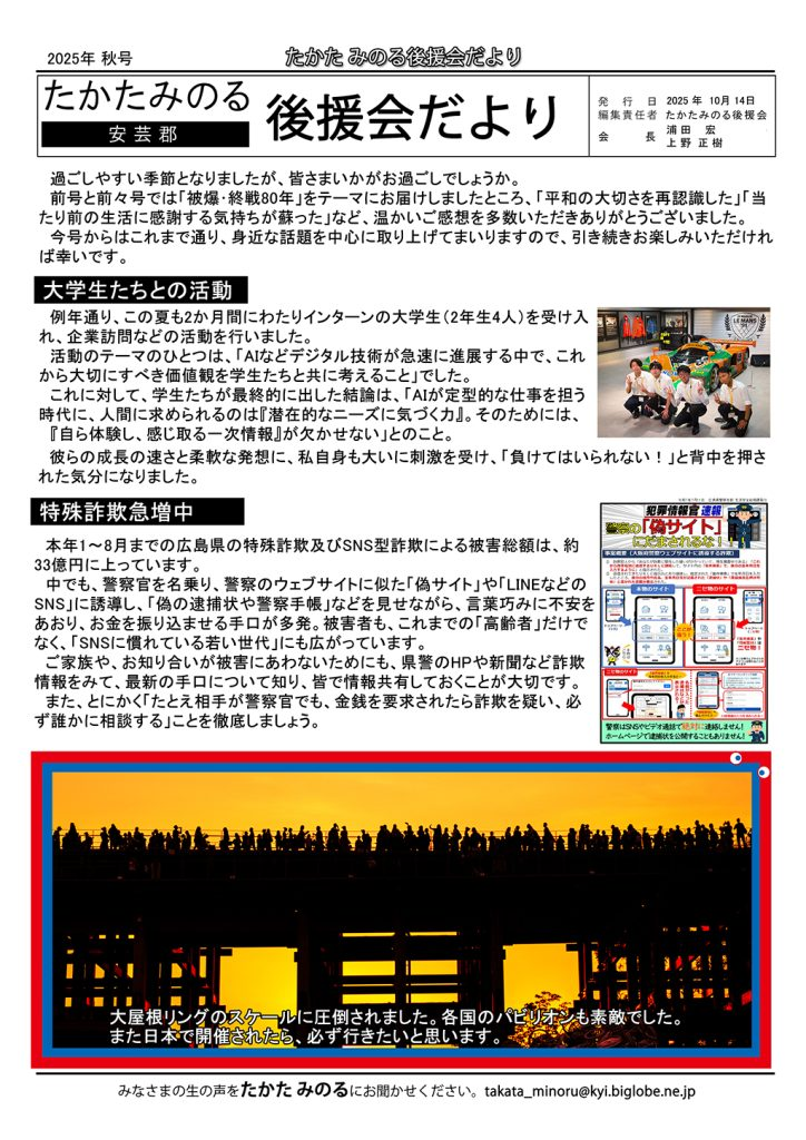 ■ 10月14日(火) 後援会だより(秋号)発送