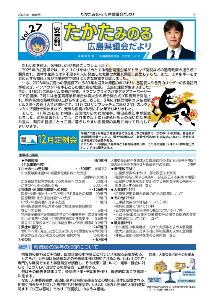 12月定例議会の内容をまとめて「県議会だより(新春号)」として、後援会に加入いただいている方を中心に発送いたしました。本号では、新たに就任された横田県知事の県政方針などを掲載しました。新たに紙での発送が必要な方や、どなたかご紹介をしてくださる方がいらっしゃいましたら「お問い合わせフォーム」に入力しご連絡ください。