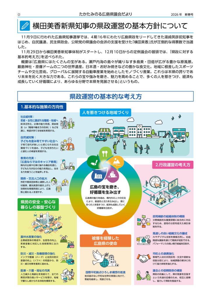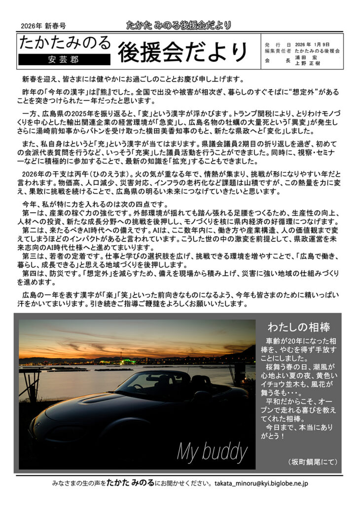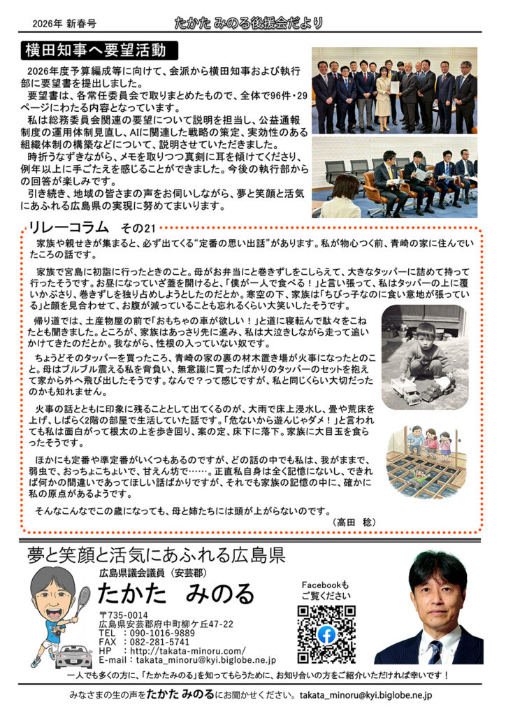■ 1月9日(金) 県議会だより(新春号)発送 12月定例議会の内容をまとめて「県議会だより(新春号)」として、後援会に加入いただいている方を中心に発送いたしました。本号では、新たに就任された横田県知事の県政方針などを掲載しました。新たに紙での発送が必要な方や、どなたかご紹介をしてくださる方がいらっしゃいましたら「お問い合わせフォーム」に入力しご連絡ください。