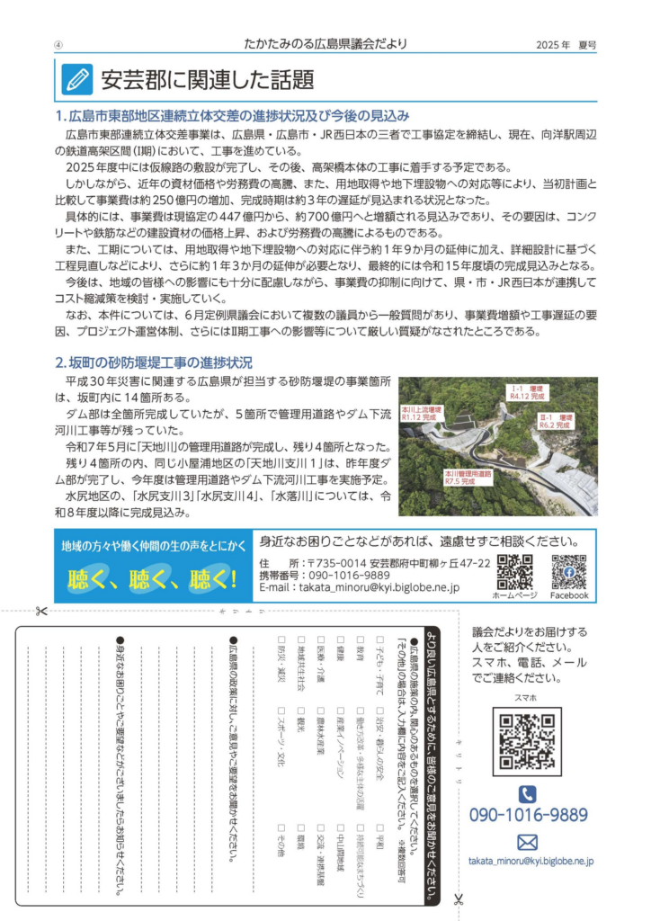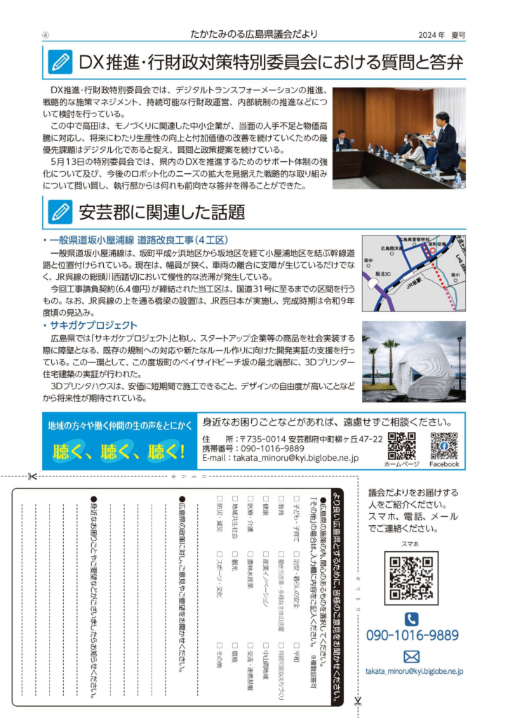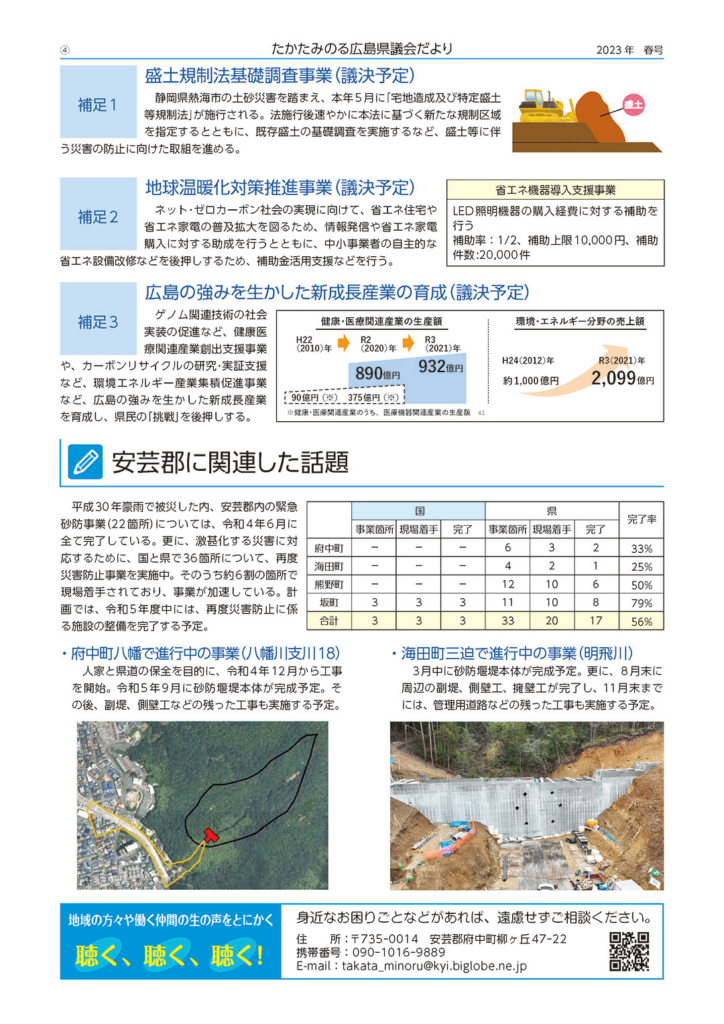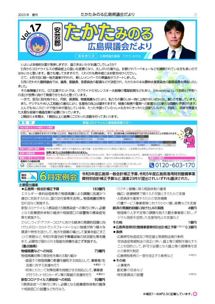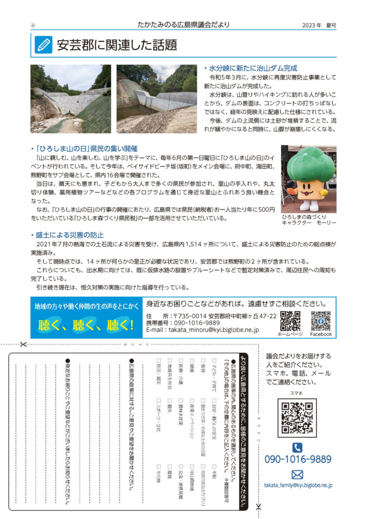 ツイート ■ 7月14日(金)広島県議会だより(春号)を発送 6月定例会は、令和5年度6月補正予算など23議案を可決並びに同意し7月4日に閉会しました。その結果などをまとめて「県議会だより(夏号)」として、後援会に加入いただいている方を中心に発送いたしました。 今号では、通常の議会での議論に関する報告と補足に加え、安芸郡に関する話題として、「水分峡の新たな治山ダム」、「ひろしま山の日県民の集い」、「盛土による災害防止」についても掲載しました。 紙での発送が必要な方や、どなたかご紹介をしてくださる方がいらっしゃれば、「お問い合わせフォーム」に入力しご連絡ください。