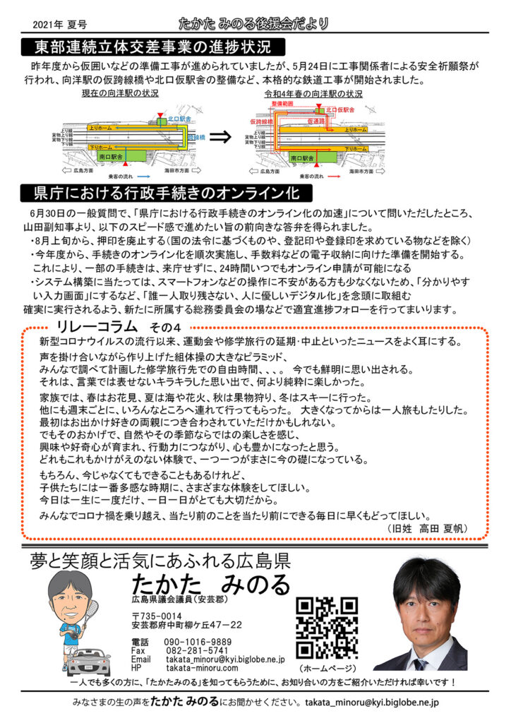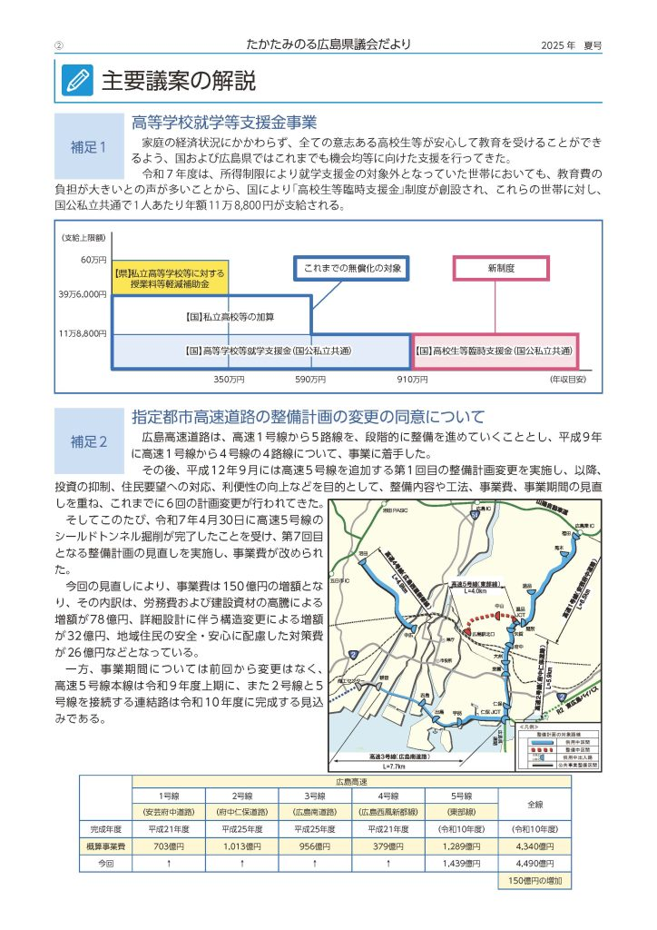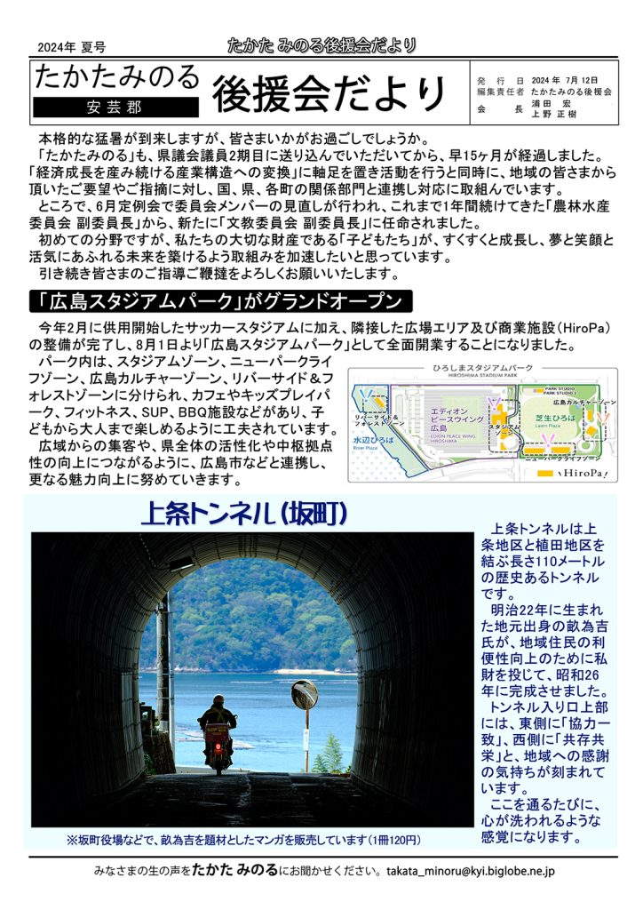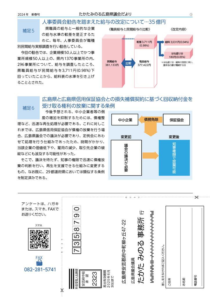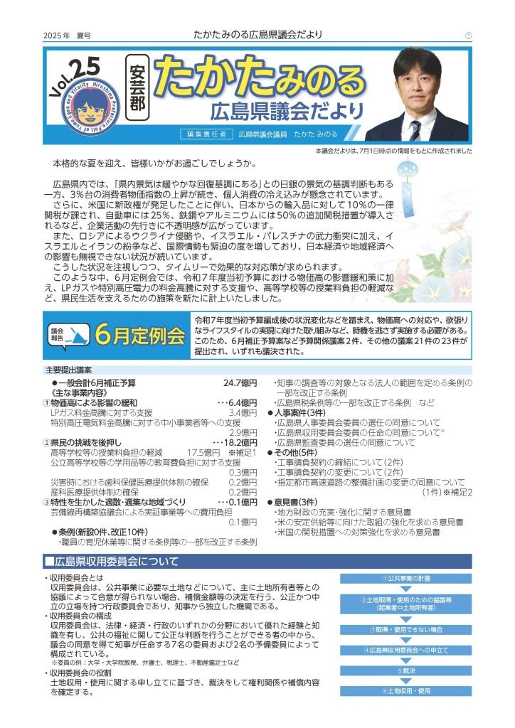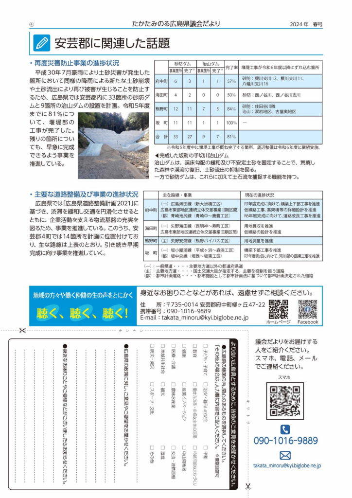 ツイート ■ 7月14日(金)広島県議会だより(春号)を発送 6月定例会は、令和5年度6月補正予算など23議案を可決並びに同意し7月4日に閉会しました。その結果などをまとめて「県議会だより(夏号)」として、後援会に加入いただいている方を中心に発送いたしました。 今号では、通常の議会での議論に関する報告と補足に加え、安芸郡に関する話題として、「水分峡の新たな治山ダム」、「ひろしま山の日県民の集い」、「盛土による災害防止」についても掲載しました。 紙での発送が必要な方や、どなたかご紹介をしてくださる方がいらっしゃれば、「お問い合わせフォーム」に入力しご連絡ください。
