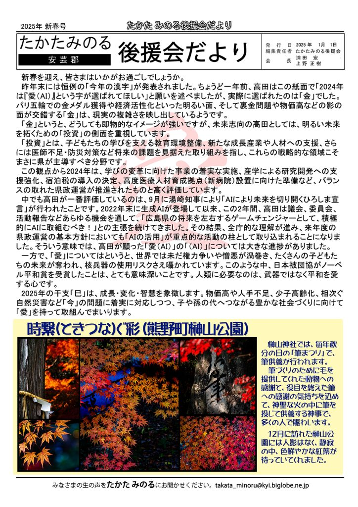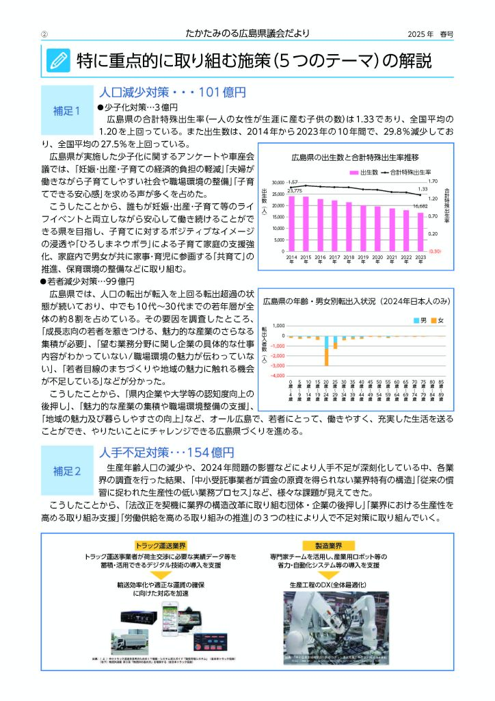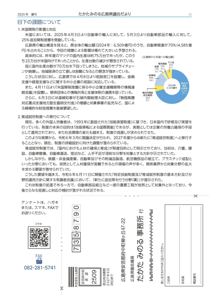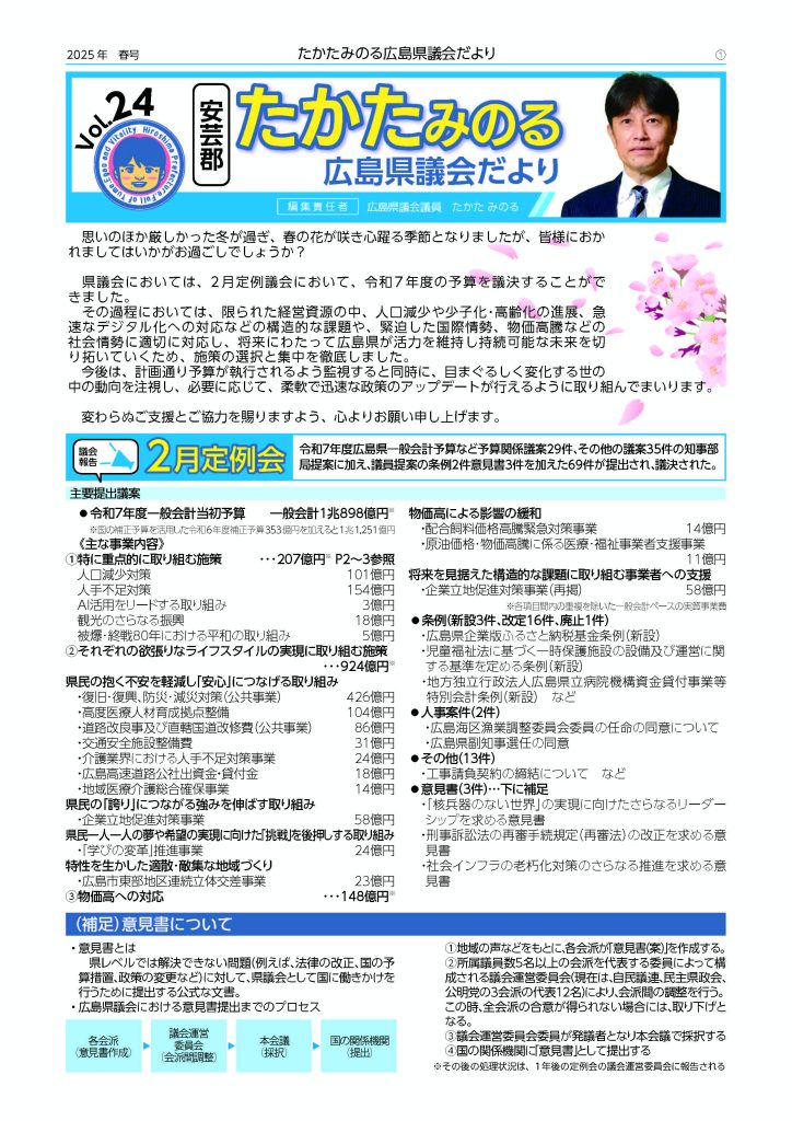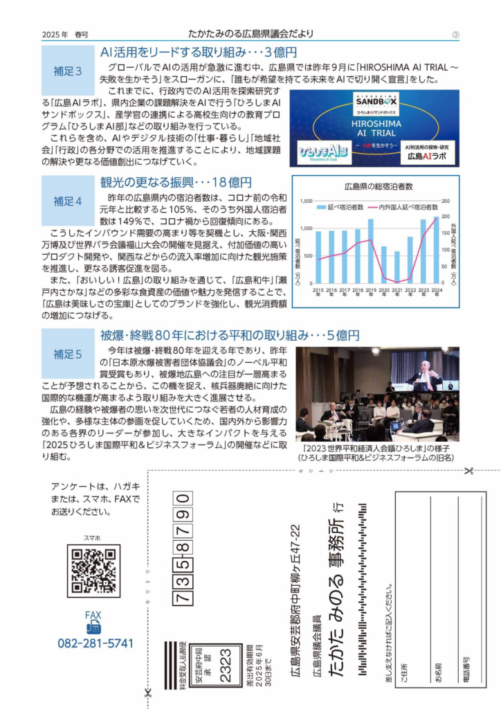 ツイート ■ 3月28日(金) 県議会だより(春号)発送 2月定例会は、令和7年度一般会計予算など69議案を議決し、3月17日に閉会しました。その結果などをまとめて「県議会だより(春号)」として、後援会に加入いただいている方を中心に発送いたしました。 今号では、令和7年度に広島県が特に重点的に取り組む施策(5つのテーマ)の補足などを中心に掲載しました。 紙での発送が必要な方や、どなたかご紹介をしてくださる方がいらっしゃれば、「お問い合わせフォーム」に入力しご連絡ください。