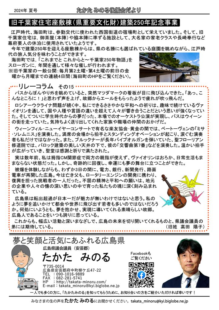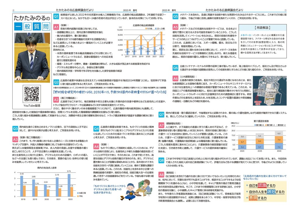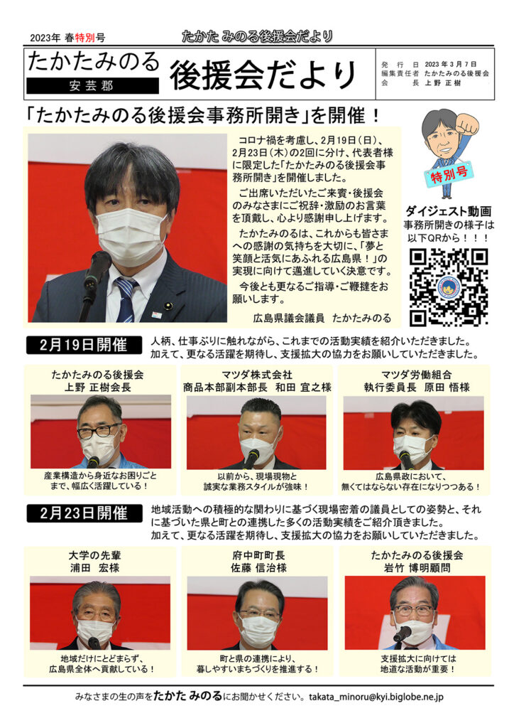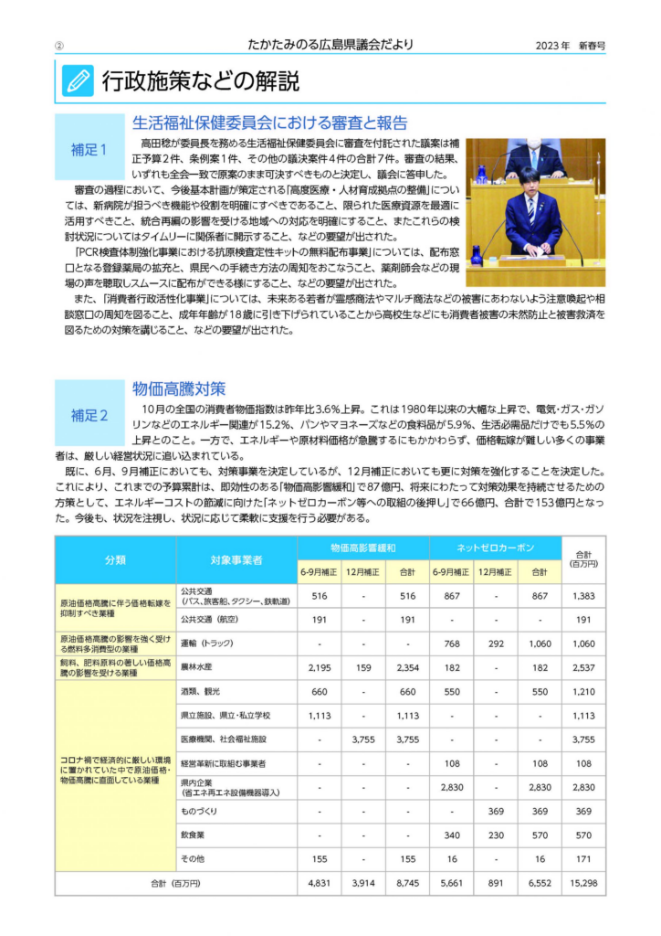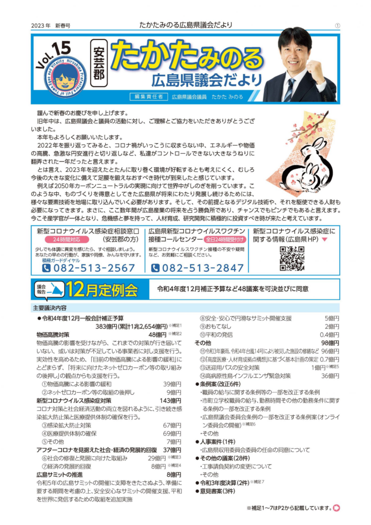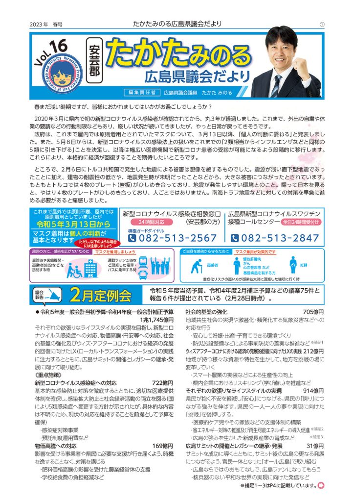 ツイート ■ 3月7日(火)広島県議会だより(春号)を発送 2月定例会は本日が閉会日でしたが、統一地方選挙の関係で、早めに議会だよりを発送する必要があるため、2月28日までの議論の内容をまとめて春号として作成しました。 記載している、令和5年度当初予算、令和4年度2月補正予算などの議案75件と、報告6件については、想定通り通過いたしました。また、たかたみのるが行った一般質問の内容について、ポイントを絞ってまとめておりますので、是非ご覧ください。 紙での発想が必要な方や、どなたかご紹介をしてくださる方がいらっしゃれば、「お問い合わせフォーム」に入力するか、直接「電話」でご連絡ください。