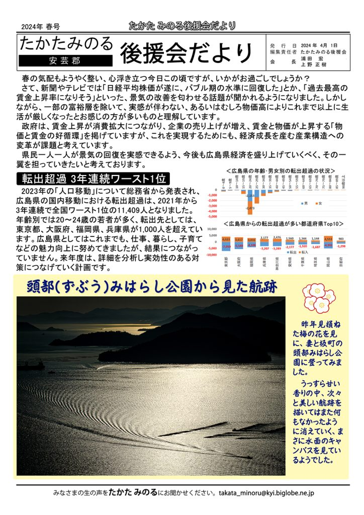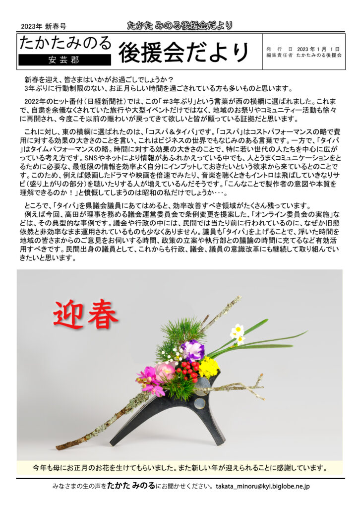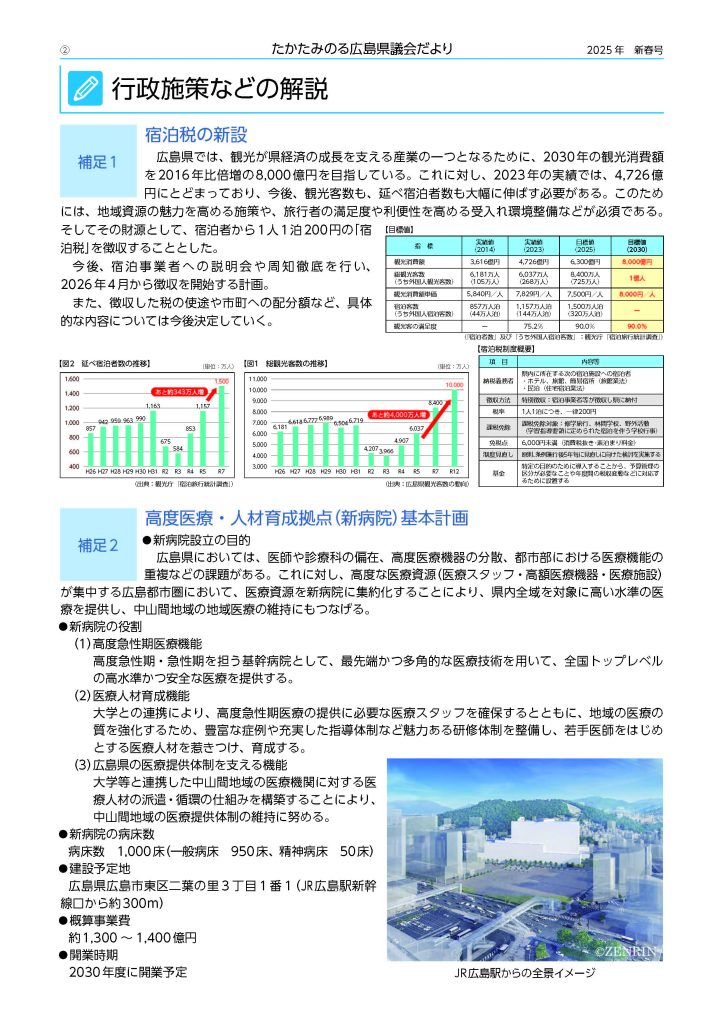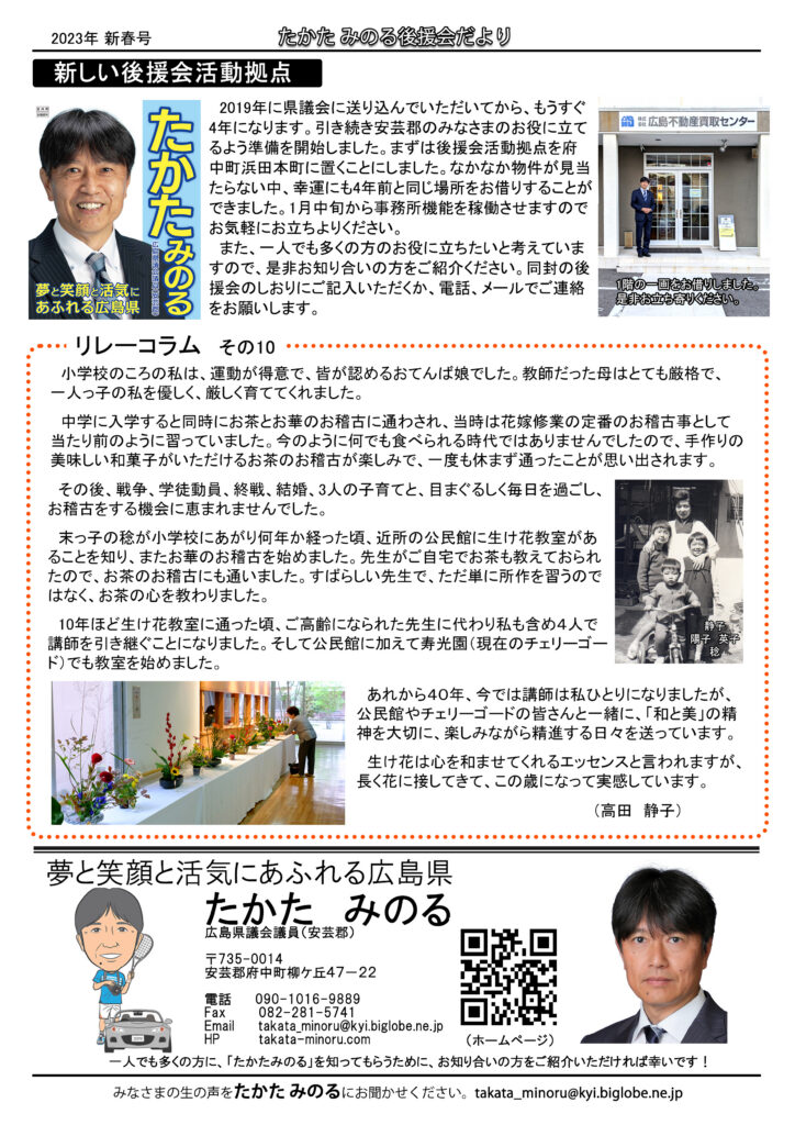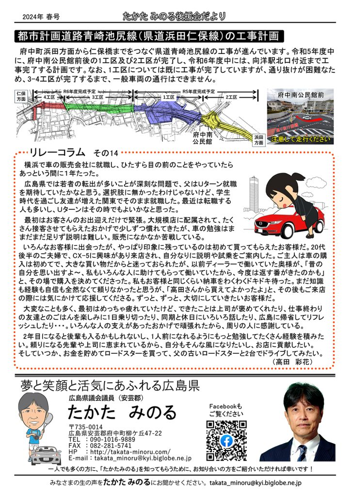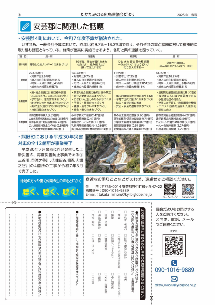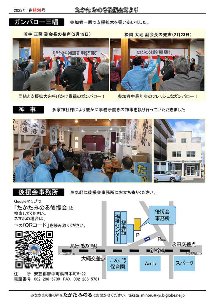 ツイート ■ 3月7日(火)広島県議会だより(春号)を発送 2月定例会は本日が閉会日でしたが、統一地方選挙の関係で、早めに議会だよりを発送する必要があるため、2月28日までの議論の内容をまとめて春号として作成しました。 記載している、令和5年度当初予算、令和4年度2月補正予算などの議案75件と、報告6件については、想定通り通過いたしました。また、たかたみのるが行った一般質問の内容について、ポイントを絞ってまとめておりますので、是非ご覧ください。 紙での発想が必要な方や、どなたかご紹介をしてくださる方がいらっしゃれば、「お問い合わせフォーム」に入力するか、直接「電話」でご連絡ください。