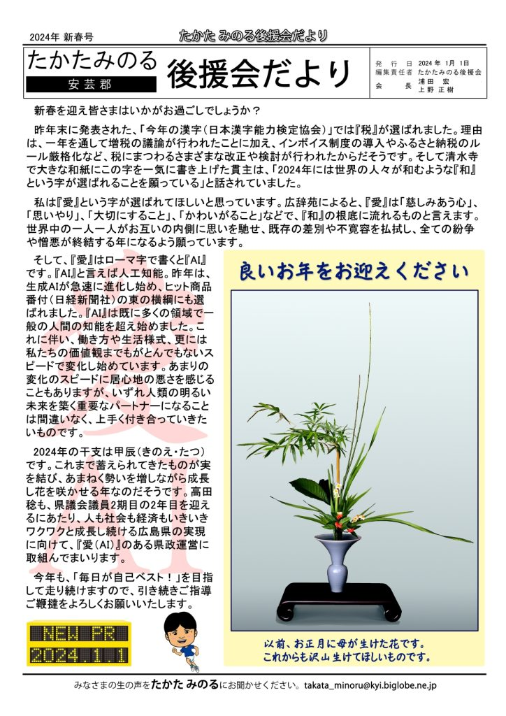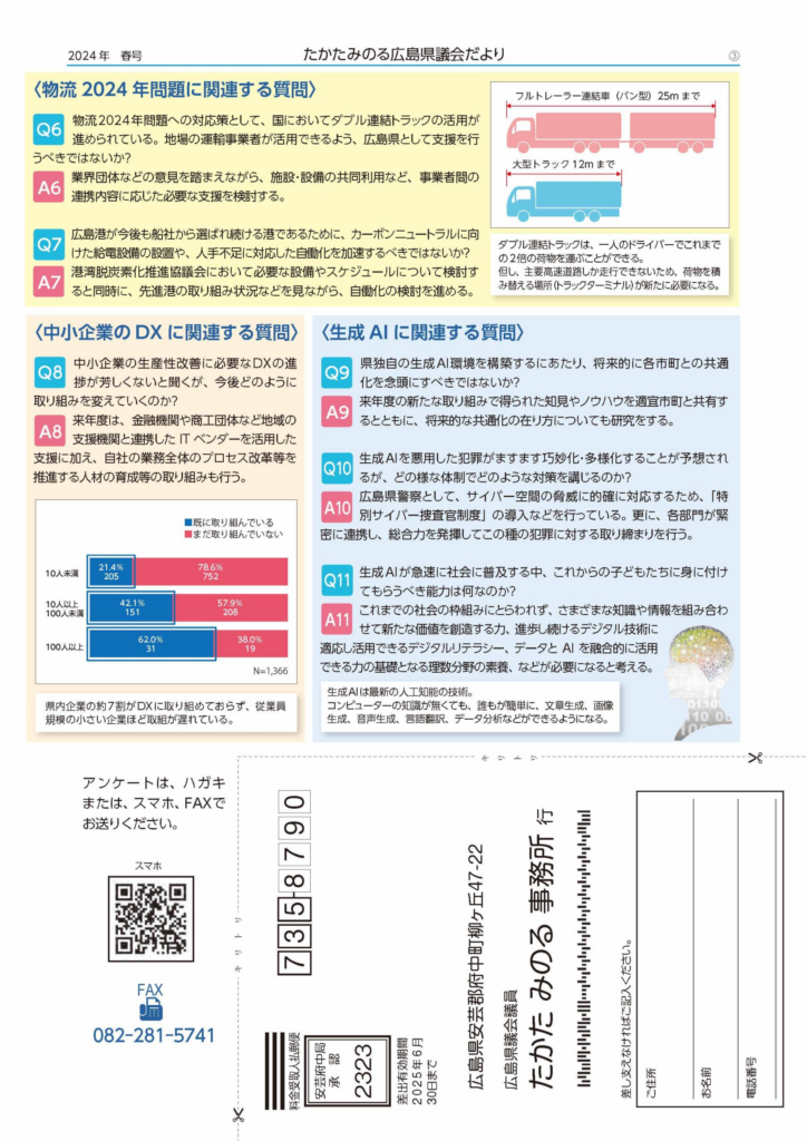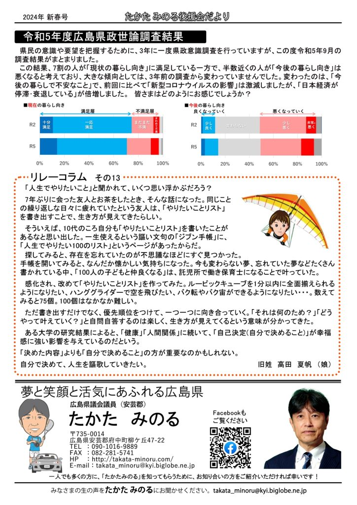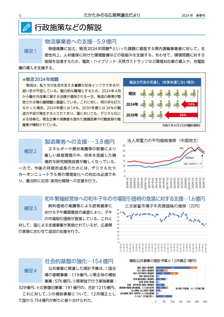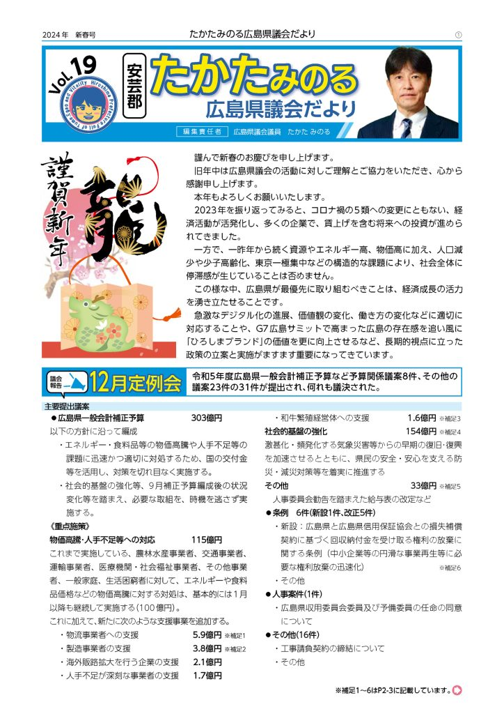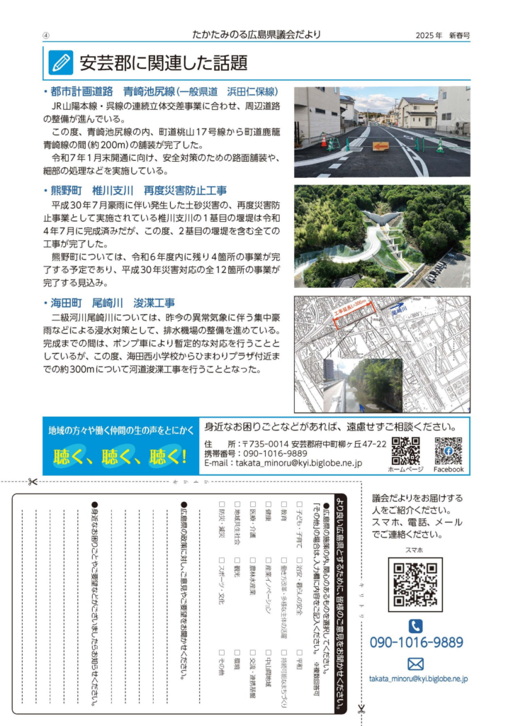 ツイート ■ 12月28日(木)県議会だより(新春号)発送 12月定例会は、令和5年度12月補正予算など31議案を可決並びに同意し12月19日に閉会しました。その結果などをまとめて「県議会だより(新春号)」として、後援会に加入いただいている方を中心に発送いたしました。 今号では、通常の議会での議論に関する報告と補足に加え、安芸郡に関する話題として、「東部連続立体交差事業の進捗状況」、「盛土による災害防止のための点検状況」などについても掲載しました。 紙での発送が必要な方や、どなたかご紹介をしてくださる方がいらっしゃれば、「お問い合わせフォーム」に入力しご連絡ください。