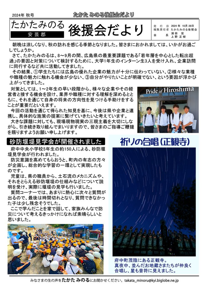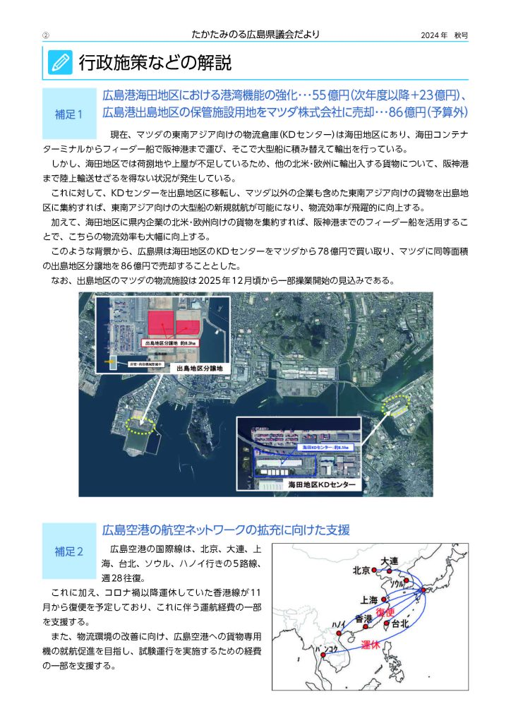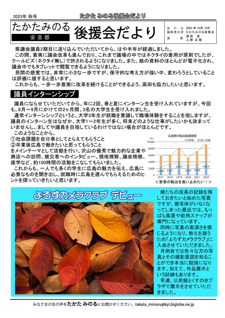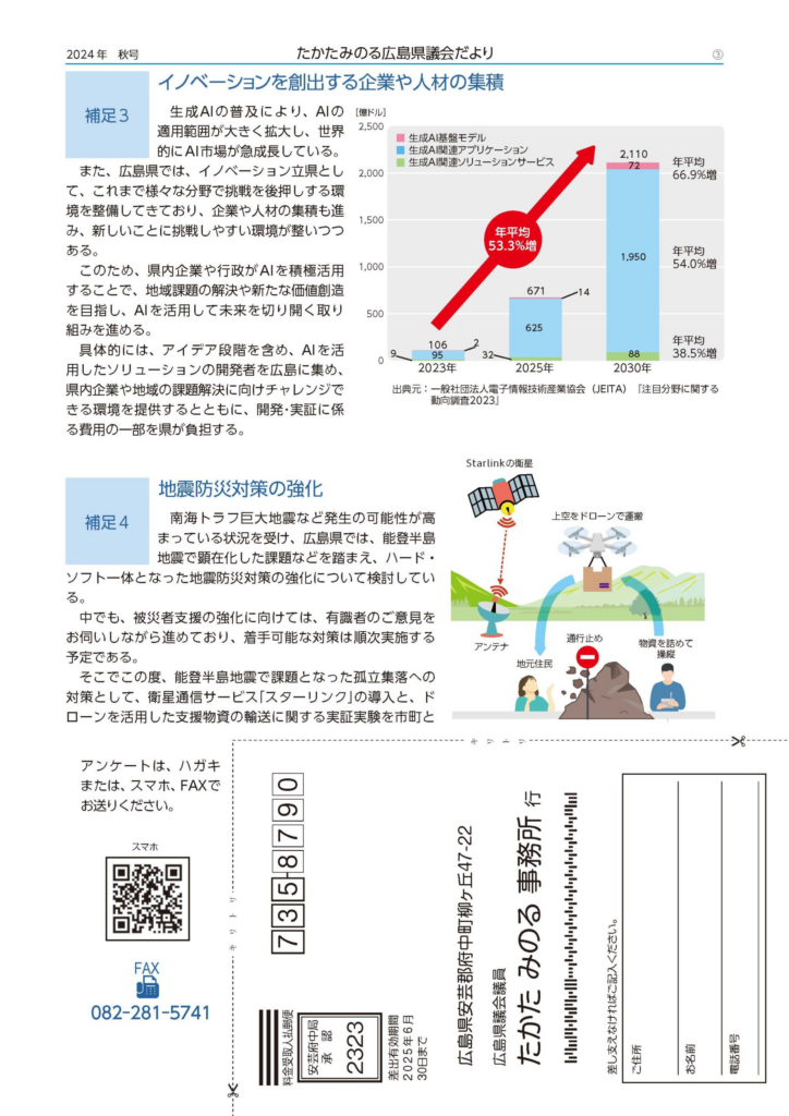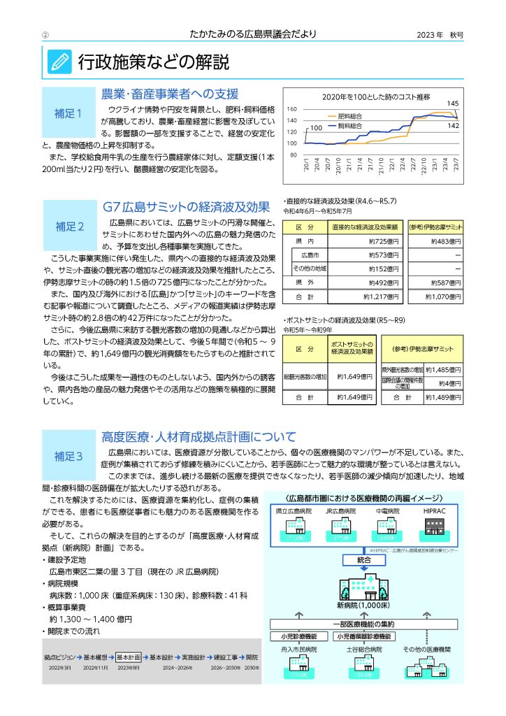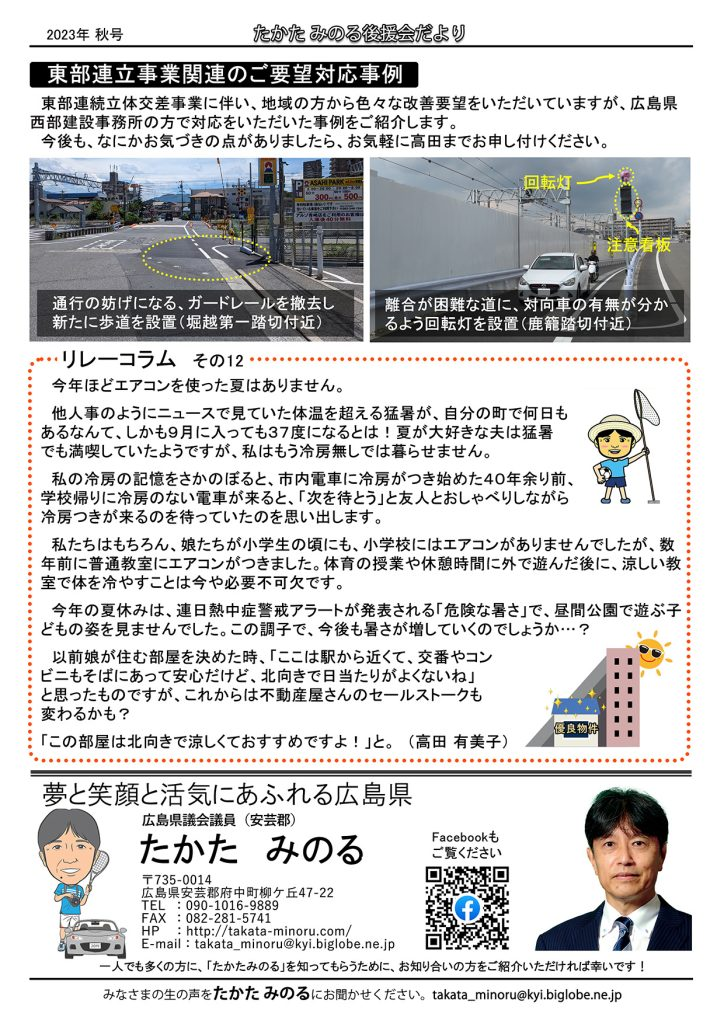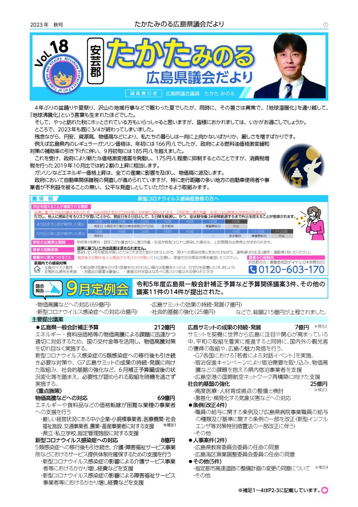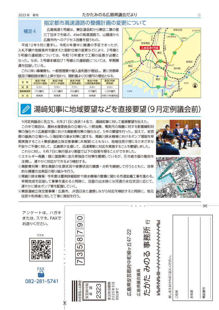 ツイート ■ 10月12日(木)広島県議会だより(秋号)を発送 9月定例会は、令和5年度9月補正予算など14議案を可決並びに同意し10月2日に閉会しました。その結果などをまとめて「県議会だより(秋号)」として、後援会に加入いただいている方を中心に発送いたしました。 今号では、通常の議会での議論に関する報告と補足に加え、安芸郡に関する話題として、「海田町役場新庁舎の完成」、「平成30年7月豪雨災害の再度災害防止事業」についても掲載しました。 紙での発送が必要な方や、どなたかご紹介をしてくださる方がいらっしゃれば、「お問い合わせフォーム」に入力しご連絡ください。