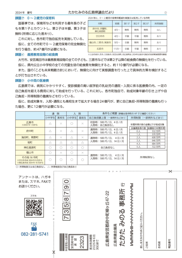 ツイート ■ 7月11日(木) 県議会だより(夏号)発送 6月定例会は、令和6年度一般会計補正予算など20議案が議決され、7月2日に閉会しました。その結果などをまとめて「県議会だより(夏号)」として、後援会に加入いただいている方を中心に発送いたしました。 今号では、通常の議会での議論に関する報告と補足に加え、「子育て家庭への公費負担の現状と課題について」などを掲載いたしました。 紙での発送が必要な方や、どなたかご紹介をしてくださる方がいらっしゃれば、「お問い合わせフォーム」に入力しご連絡ください。