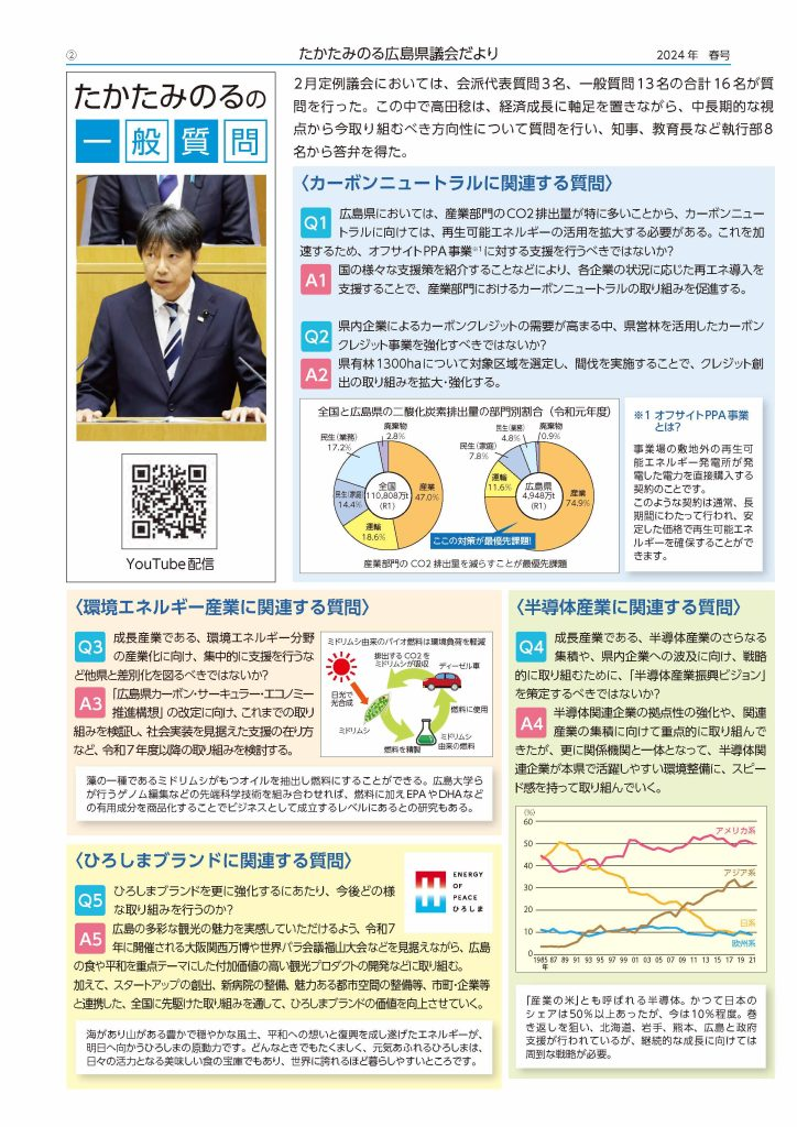 ツイート ■ 2月22日 2月定例会一般質問 県議会議員2期目に入り、最初の一般質問を行わせていただきました。 今回は初心に戻り、私のビジョンである「夢と笑顔と活気にあふれる広島県を子や孫の世代にバトンタッチする」ための前提となる、経済成長に軸足を置いた質問をいたしました。 30分の質問に対し、執行部からは、知事や教育長をはじめ8名により、30分の答弁をいただきました。決して、「即実行!」のような答弁ではありませんでしたが、意図は十分に伝わっており、将来に向けた布石になったものと感じました。 具体的な質問項目は以下。 1 カーボンニュートラルに向けた取組について (1)再生可能エネルギーを活用するオフサイトPPA事業への支援について (2)県営林を活用したカーボンクレジット事業の強化について2 環境・エネルギー分野の産業化に向けた今後の展開について3 半導体産業の振興に係るビジョン等の策定について4 物流の強化について (1)トラック輸送の効率化への対応について (2)広島港の物流機能強化に向けた整備推進について5 中小企業の生産性改善に向けたDXの推進について6 生成AIの普及に伴う対応について (1)市町との共通化等を見据えた県独自の生成AI環境構築について (2)生成AIを悪用した犯罪への対策について (3)生成AIの普及を踏まえた今後の教育の在り方について7 ひろしまブランド強化に係る現状の取組と今後の展開について