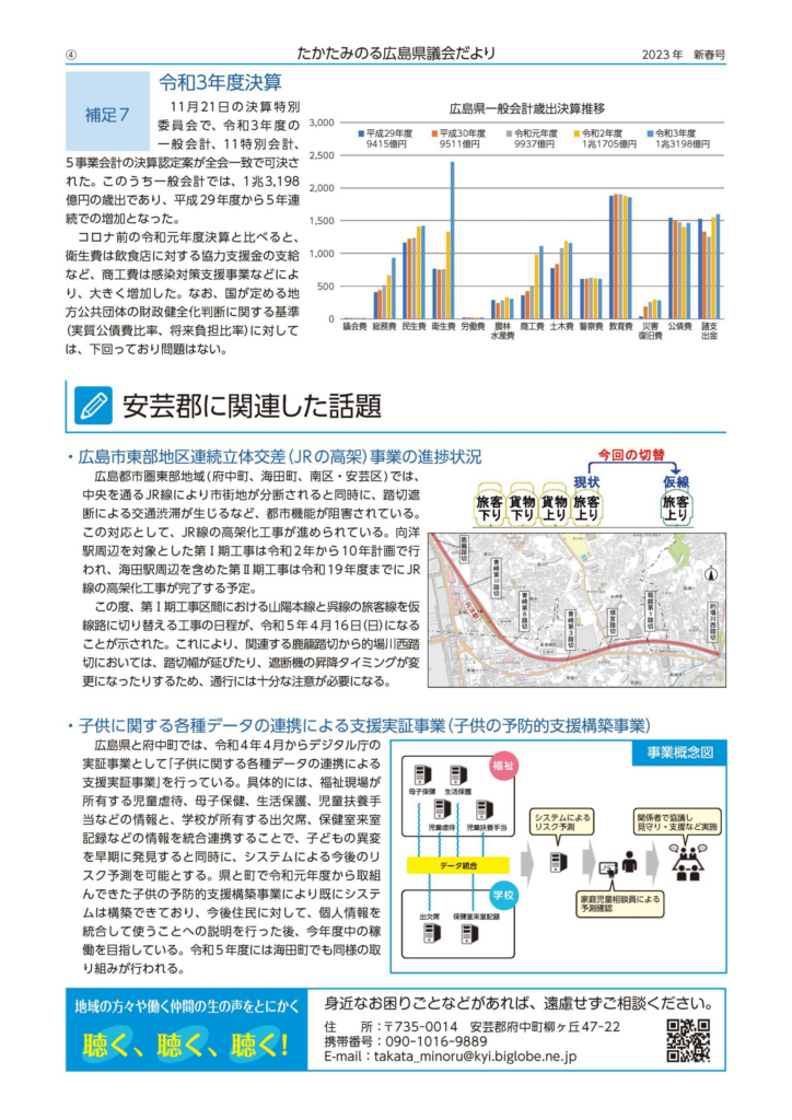 ツイート ■ 12月27日(火) 広島県議会だより(新春号)を発送 12月定例会は、令和4年度12月補正予算など48議案を可決並びに同意可決ならびに同意し、12月19日に閉会しました。その結果などをまとめて「県議会だより(新春号)」として、後援会に加入いただいている方を中心に発送いたしました。 今号では、通常の議会での議論に関する報告と補足に加え、安芸郡に関する話題として、「広島市東部地区連続立体交差(JRの高架)事業の進捗状況」、「子どもに関する各種データの連携による支援実証事業」についても掲載しました。 紙での発送が必要な方や、どなたかご紹介をしてくださる方がいらっしゃれば、「お問い合わせフォーム」に入力しご連絡ください。